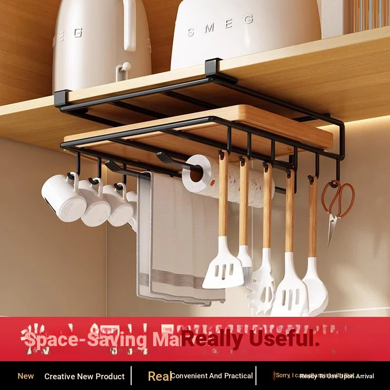 No-Drill Kitchen Storage Rack - Under-Cabinet Lid Holder, Cutting Board Organizer, Paper Towel Hanger, Multi-Tier Shelf for Easy Access to Kitchen Essentials